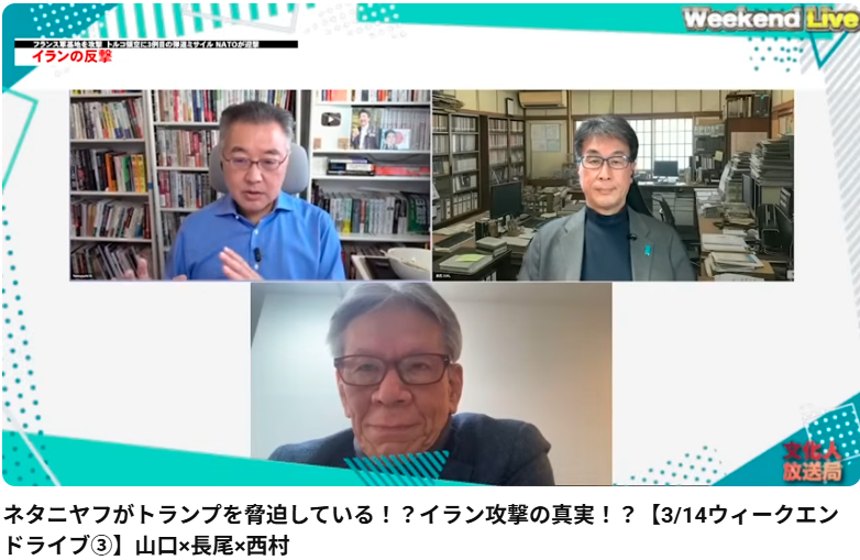 ネタニヤフがトランプを脅迫している!?イラン攻撃の真実!?【3/14ウィークエンドライブ③】山口×長尾×西村 ご提示いただいた動画(2026年3月14日配信の「文化人ウィークエンドライブ」)では、山口敬之氏、長尾たかし氏、西村幸祐氏の3名が、トランプ政... -
