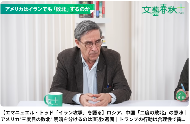 【エマニュエル・トッド「イラン攻撃」を語る】ロシア、中国「二度の敗北」の意味|アメリカ“三度目の敗北” 明暗を分けるのは直近2週間|トランプの行動は合理性で説明できない|世界各国は核武装へと向かう 歴史人口学者のエマニュエル・トッド氏が、2026... -