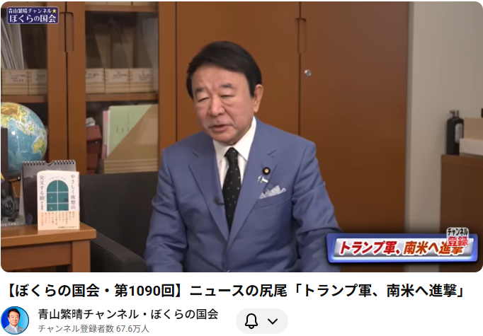 【ぼくらの国会・第1090回】ニュースの尻尾「トランプ軍、南米へ進撃」 このYouTube動画は2025年12月5日に「青山繁晴チャンネル・ぼくらの国会」で配信されたものです。 📝 動画の要旨 この動画では、「トランプ軍、南米へ進撃」というテーマに基づ... -