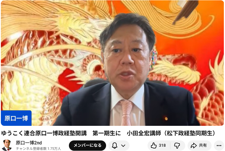 ゆうこく連合原口一博政経塾開講 第一期生に 小田全宏講師(松下政経塾同期生) この動画は、衆議院議員の原口一博氏によるライブ配信(2026年4月9日公開)で、自身が主宰する「ゆうこく連合 原口一博政経塾」の開講について報告する内容です。 主な内容... -