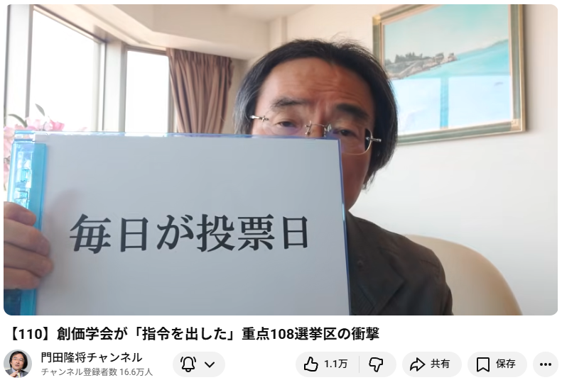 【110】創価学会が「指令を出した」重点108選挙区の衝撃 この動画は、ジャーナリストの門田隆将氏が、総選挙(衆議院議員選挙)を目前に控えた創価学会の動向に関する「スクープ」について解説している内容です。 主な内容 創価学会の「重点108選挙区」へ... -