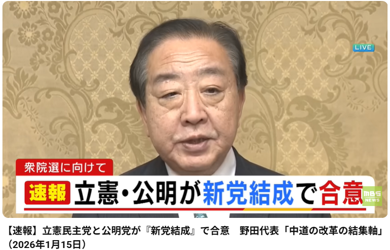 【速報】立憲民主党と公明党が『新党結成』で合意 野田代表「中道の改革の結集軸」(2026年1月15日) この動画(MBS NEWS配信)に基づき、立憲民主党と公明党の新党結成合意に関する詳細をお伝えします。 2026年1月15日、立憲民主党の野田代表は公明党の... -