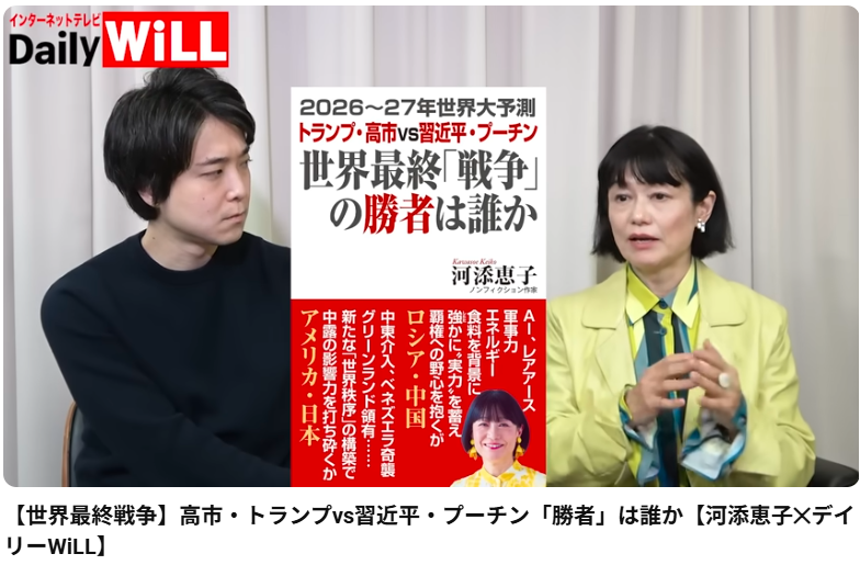 【世界最終戦争】高市・トランプvs習近平・プーチン『勝者』は誰か【河添恵子✕デイリーWiLL】 この動画では、ノンフィクション作家の河添恵子氏が、近著の内容を交えながら現在の緊迫した国際情勢と今後の予測について解説しています。 動画の主な内容 1. ... -