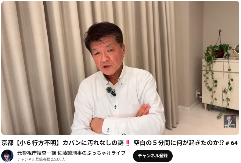 京都【小6行方不明】カバンに汚れなしの謎‼️ 空白の5分間に何が起きたのか⁉︎ # 64 このYouTube動画は、元警視庁捜査一課刑事の佐藤誠氏によるライブ配信で、京都府南丹市園部町で小学6年生の男児が行方不明になっている事案につい... -