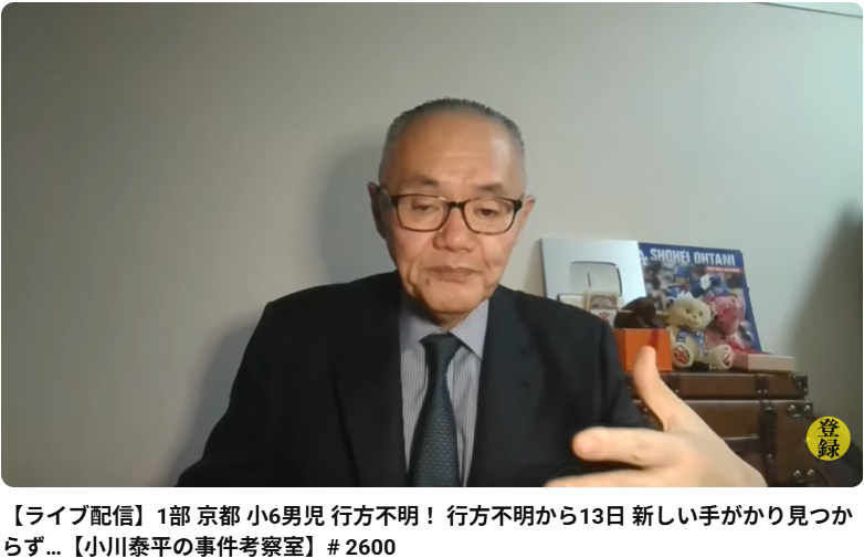 【ライブ配信】1部 京都 小6男児 行方不明! 行方不明から13日 新しい手がかり見つからず…【小川泰平の事件考察室】# 2600 この動画は、元刑事の小川泰平氏による、京都府舞鶴市で発生した小学6年生の男児行方不明事件に関するライブ配信(2026年4月5日実...
