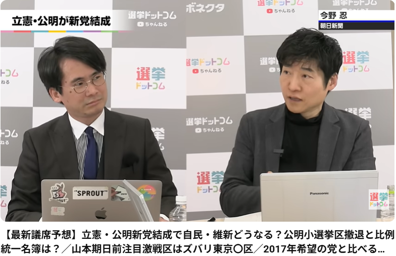 【最新議席予想】立憲・公明新党結成で自民・維新どうなる? この動画は、YouTubeチャンネル「選挙ドットコムちゃんねる」によるもので、朝日新聞の今野忍記者をゲストに迎え、立憲民主党と公明党の新党結成や、それに伴う最新の議席予想、今後の政局の展... -