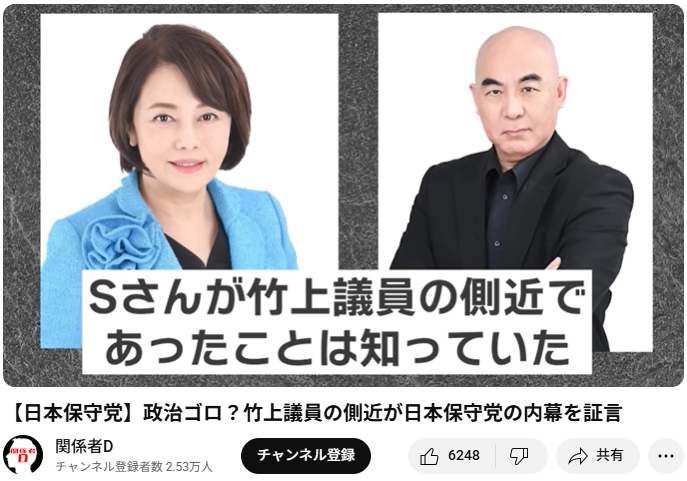「【日本保守党】政治ゴロ?竹上議員の側近が日本保守党の内幕を証言」 YouTubeチャンネル「関係者D」に投稿された動画です。 この動画では、日本保守党を離党した竹上議員の側近であるS氏が、党執行部(百田氏、有本氏)から「政治ゴロ」と非難されている... -