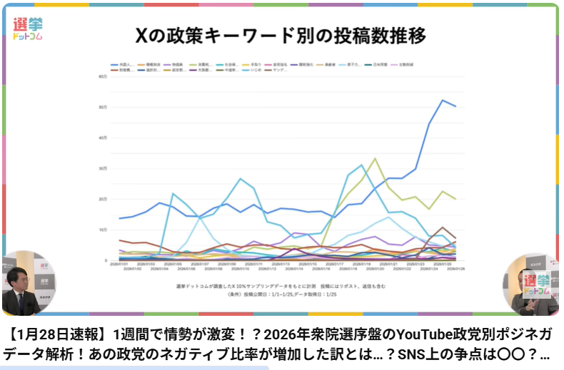 【1月28日速報】1週間で情勢が激変!?2026年衆院選序盤のYouTube政党別ポジネガデータ解析!あの政党のネガティブ比率が増加した訳とは…?SNS上の争点は〇〇?/重大告知あり!|選挙ドットコム このYouTube動画は、選挙ドットコムちゃんねるによる「2026... -