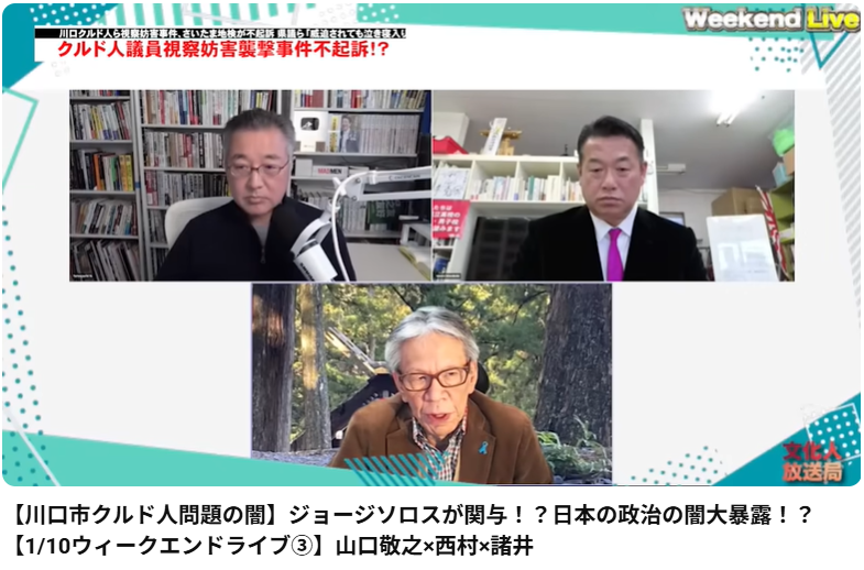 【川口市クルド人問題の闇】ジョージソロスが関与!?日本の政治の闇大暴露!? この動画は、2026年1月10日に配信された「文化人ウィークエンドライブ」の抜粋で、山口敬之氏、西村幸祐氏、そして埼玉県議会議員の諸井真英氏が、埼玉県川口市で深刻化して... -