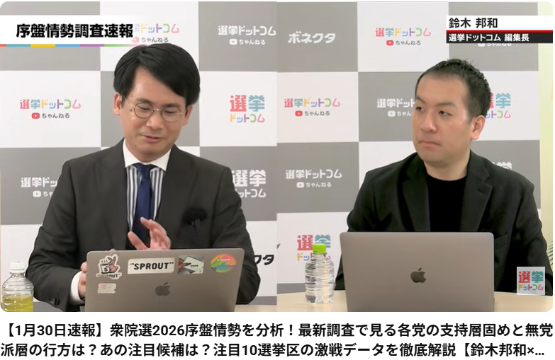 【1月30日速報】衆院選2026序盤情勢を分析!最新調査で見る各党の支持層固めと無党派層の行方は?あの注目候補は?注目10選挙区の激戦データを徹底解説【鈴木邦和×山本期日前】 この動画は、選挙ドットコムちゃんねるによる「2026年衆院選の序盤情勢分析」... -