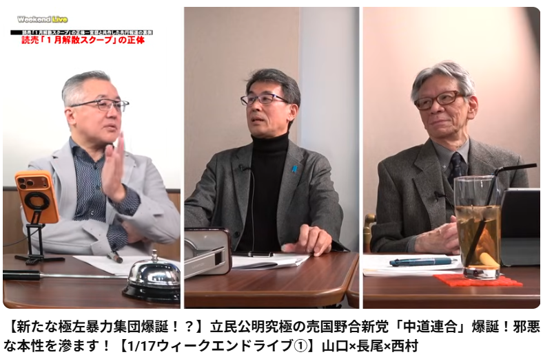 【新たな極左暴力集団爆誕!?】立民公明究極の売国野合新党「中道連合」爆誕!邪悪な本性を滲ます!【1/17ウィークエンドライブ①】山口×長尾×西村 この動画は、2026年1月17日に配信された「文化人ウィークエンドライブ」の冒頭部分で、山口敬之氏、長尾敬... -