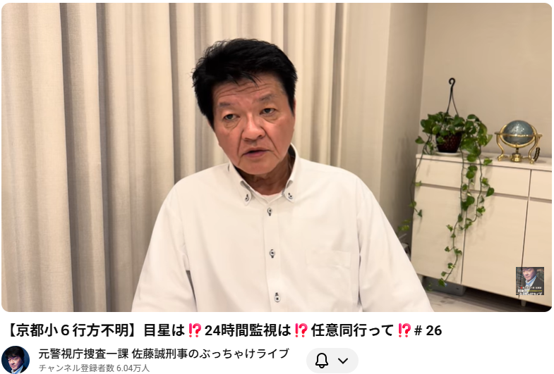 【京都小6行方不明】目星は⁉️24時間監視は⁉️任意同行って⁉️# 26 このYouTube動画は、元警視庁捜査一課の佐藤誠氏が、京都で発生した小学6年生の男児行方不明事件(安達結希くんの事件)について、警察捜査の裏...