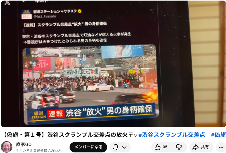 【偽旗・第1号】渋谷スクランブル交差点の放火〒○ #渋谷スクランブル交差点 #偽旗 この動画は、2026年4月3日に配信された「直家GO」というチャンネルによるライブ配信です。 動画では、配信の直前に発生した渋谷スクランブル交差点での放火事件につ... -