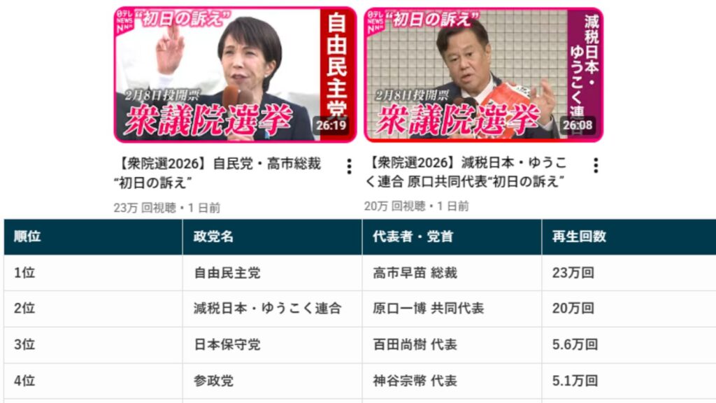 【衆院選2026】自民・ゆうこく連合が驚異の再生回数で圧倒的リード!3位以下に大差をつける「2強」のネット注目度ランキング